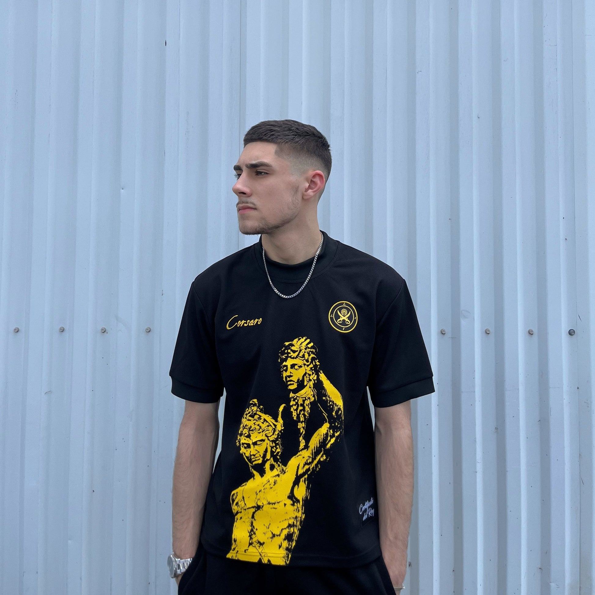 Ce maillot est orné de deux broderies et d'une grande sérigraphie représentant Perseus, ajoutant une dimension mythologique à ce maillot de Corsaro.